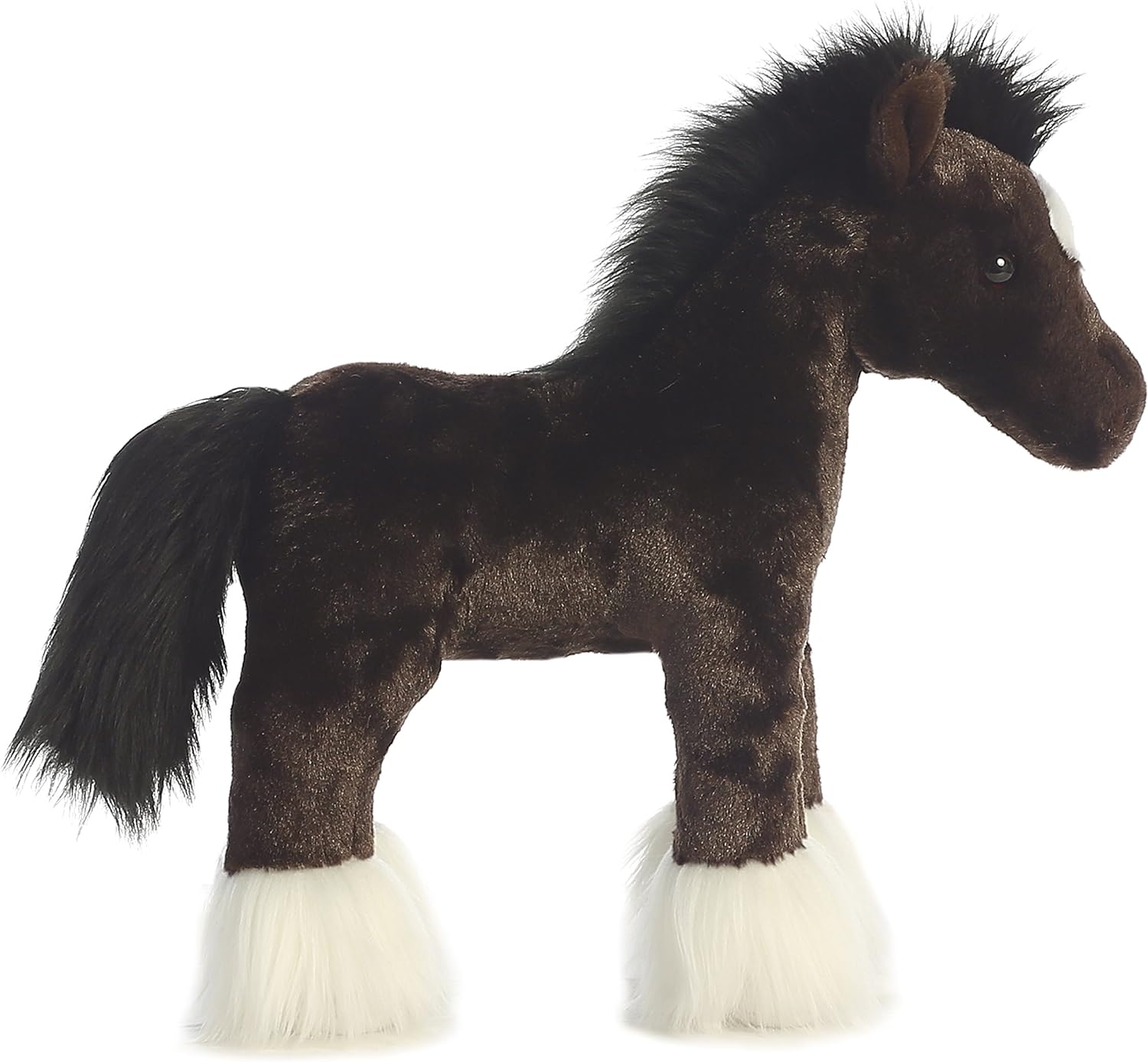 This soft standing deep brown horse has furry white hooves, a white diamond, black hair and mane and is a beautiful addition to Aurora's equestrian selection!